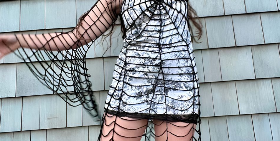 Embody poise and dominance with a flowing, long dress covered in silver web designs and rhinestone trim. A crown made in the shape of dainty spider legs is an added regal note, while dramatic eye makeup featuring metallic shimmery shades completes the ensemble. Black or deep purple is fabulous for the dress, providing contrast against the webbing details.